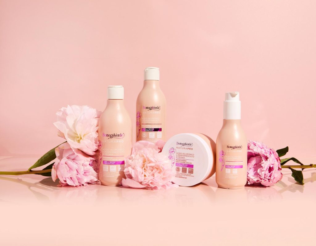 La formula della nuova linea NATURAPRO IDRATAZIONE SUBLIME è sviluppata per offrire un’idratazione intensa e prolungata, combina due attivi straordinari che agiscono per ripristinare la naturale vitalità del capello: Acido Ialuronico, noto per le sue proprietà idratanti e rimpolpanti, e iperfermentato di Peonia di Tenuta Bottega Verde, ricco di benefici rivitalizzanti. I due attivi, in sinergia, agiscono in profondità per restituire morbidezza, elasticità e nuova luce ai capelli, garantendo fino a 72 ore** di idratazione.