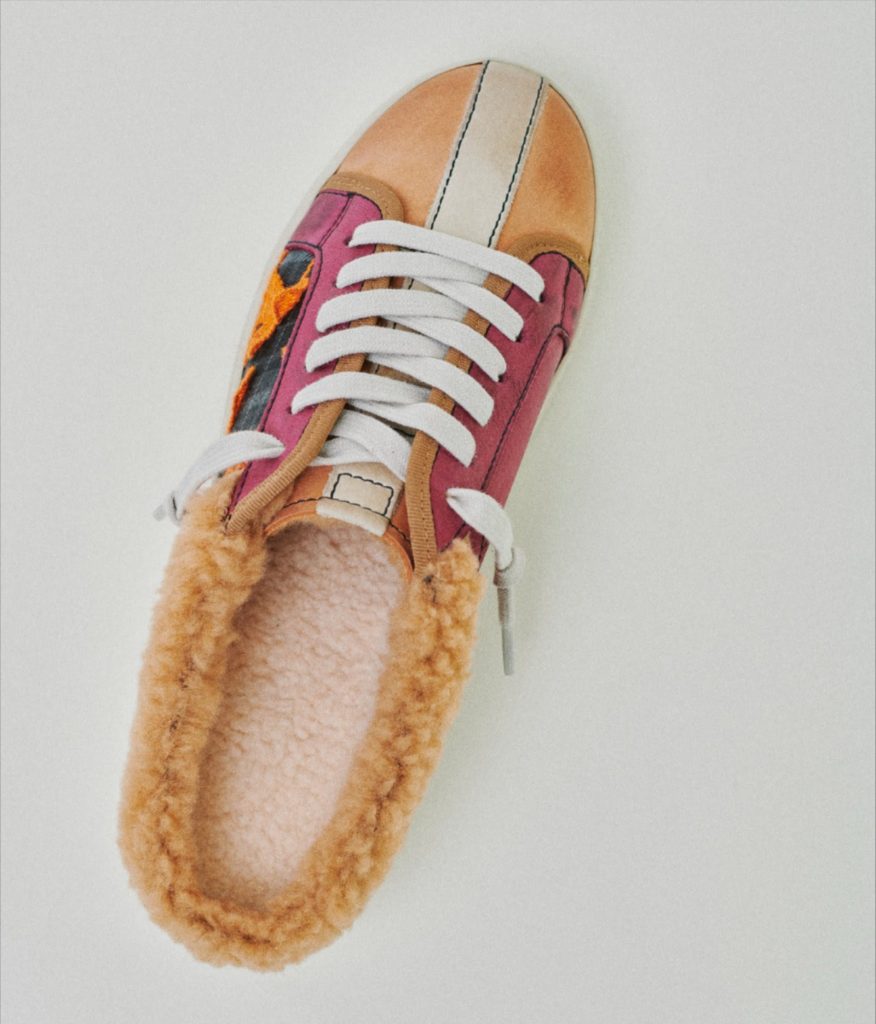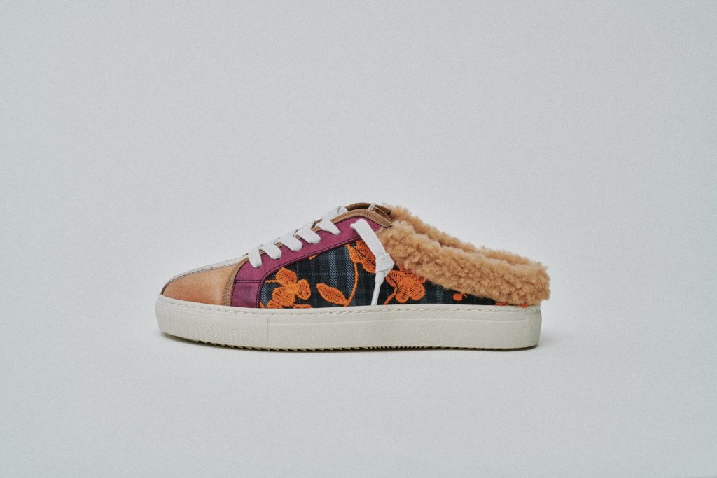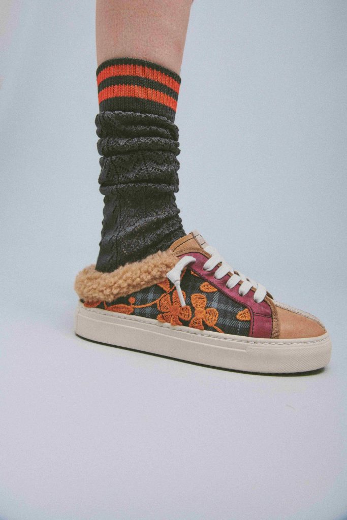 Il blu profondo del tartan che si mescola all’azzurro cielo è il trait d’union della linea che fa da sfondo al prugna e all’arancione delle applicazioni in pizzo. Nella versione sabot le nuance si fondono alla morbidezza del teddy wool degli interni in color caramello.