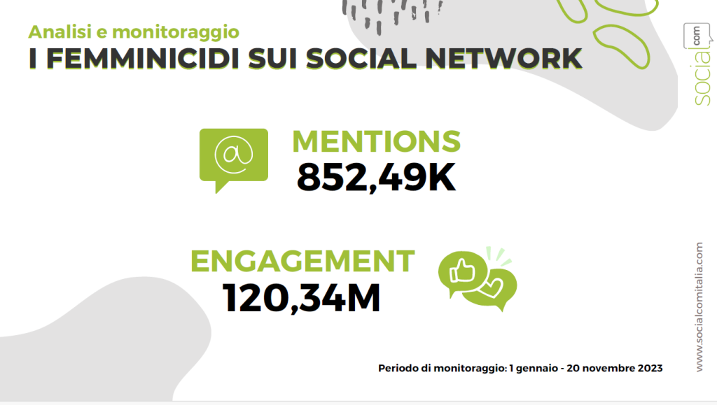 Dal 1° gennaio al 20 novembre 2023, le menzioni del tema su web e social network sono state oltre 852 mila ed hanno generato oltre 120 milioni di interazioni. Lo studio ha inoltre messo a confronto le menzioni e le interazioni sul tema femminicidi con altri temi critici come l’immigrazione (638 mila menzioni e 38 milioni di interazioni), i cambiamenti climatici (311 mila menzioni e 73 milioni di interazioni), le discriminazioni e il razzismo (310 mila menzioni e 59 milioni di interazioni), i furti e le rapine (268 mila menzioni e 35 milioni di interazioni) e la sicurezza sul lavoro (88 mila menzioni e 15 milioni di interazioni).