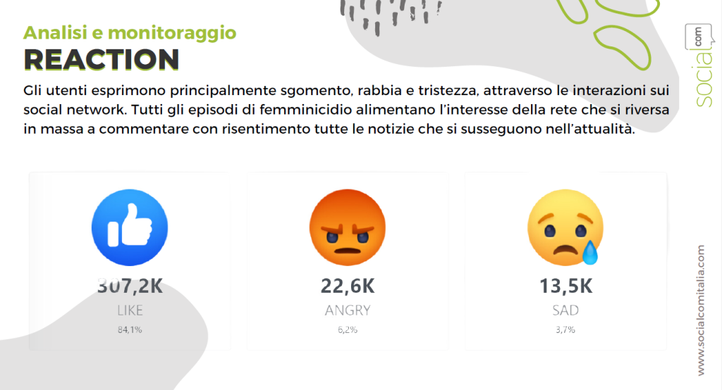Nella ricerca viene evidenziato come il sentiment degli utenti sia prevalentemente negativo (84%) e i principali commenti e reazioni riguardino emozioni avverse come la rabbia, la tristezza, la preoccupazione e lo sgomento. In generale, si registra un notevole interesse della rete che si ritrova a commentare e reagire alle notizie che si susseguono sui casi dell’attualità.
