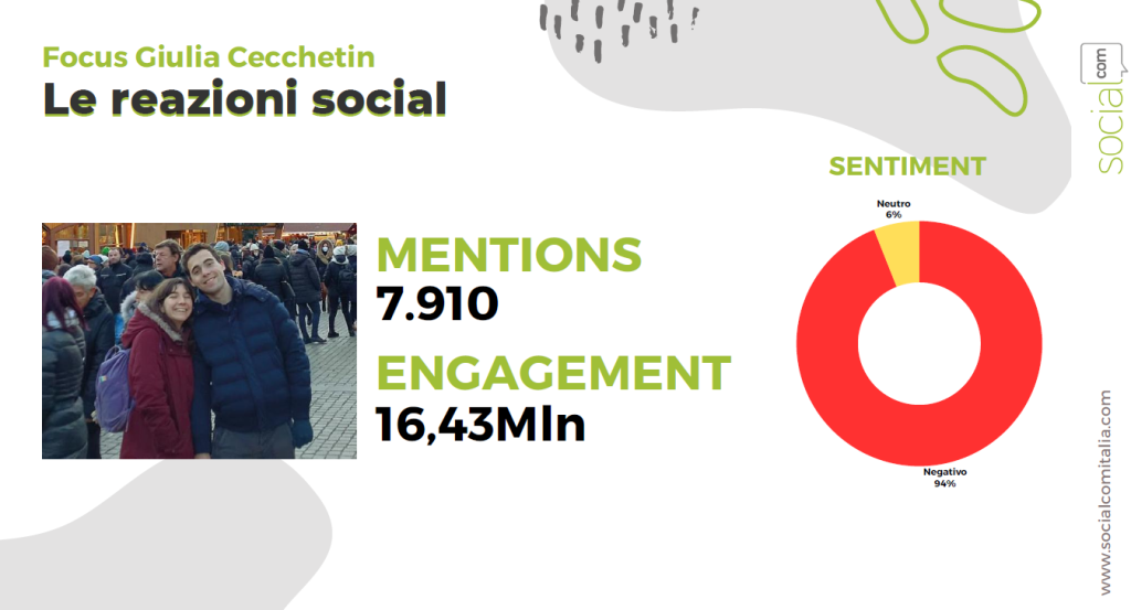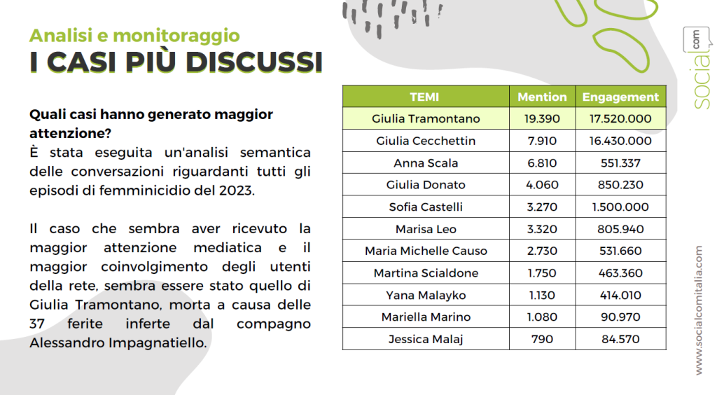 Lo studio evidenzia anche quelli che sono stati i casi che nel corso dei mesi hanno generato la maggior attenzione mediatica: Giulia Tramontano, morta a causa delle 37 ferite inferte dal compagno Alessandro Impagnatiello, è il caso che ha generato il maggior numero di menzioni (18 mila) e di interazioni (16 milioni) su web e social network. L’ultimo caso, l’omicidio di Giulia Cecchettin, ha generato oltre 7,9 mila menzioni e 16,4 milioni di interazioni.