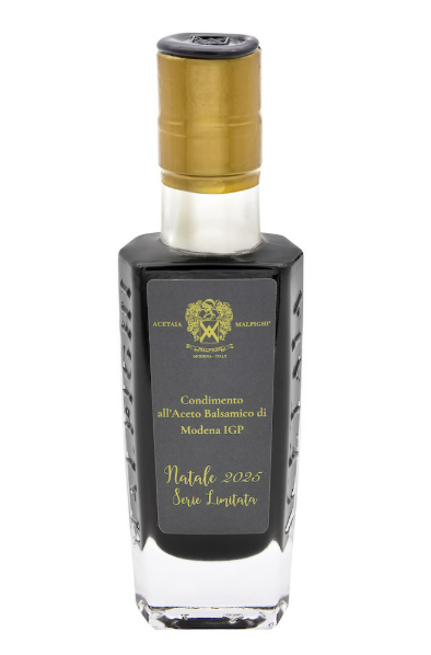 Contenuto in una bottiglia da 100 ml rigorosamente di vetro, con i colori del Natale (tappo e scritta oro, etichetta argento), il nuovo Condimento all’ ‘Aceto Balsamico di Modena IGP’ è racchiuso in un elegante cofanetto Limited Edition Natale 2025 griffato Acetaia Malpighi.