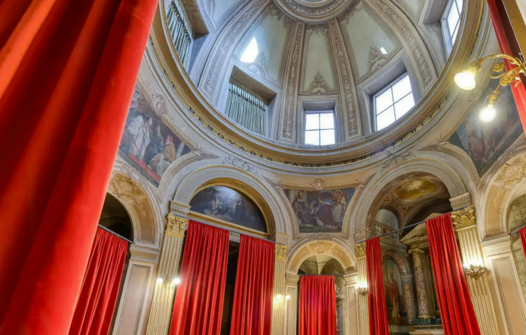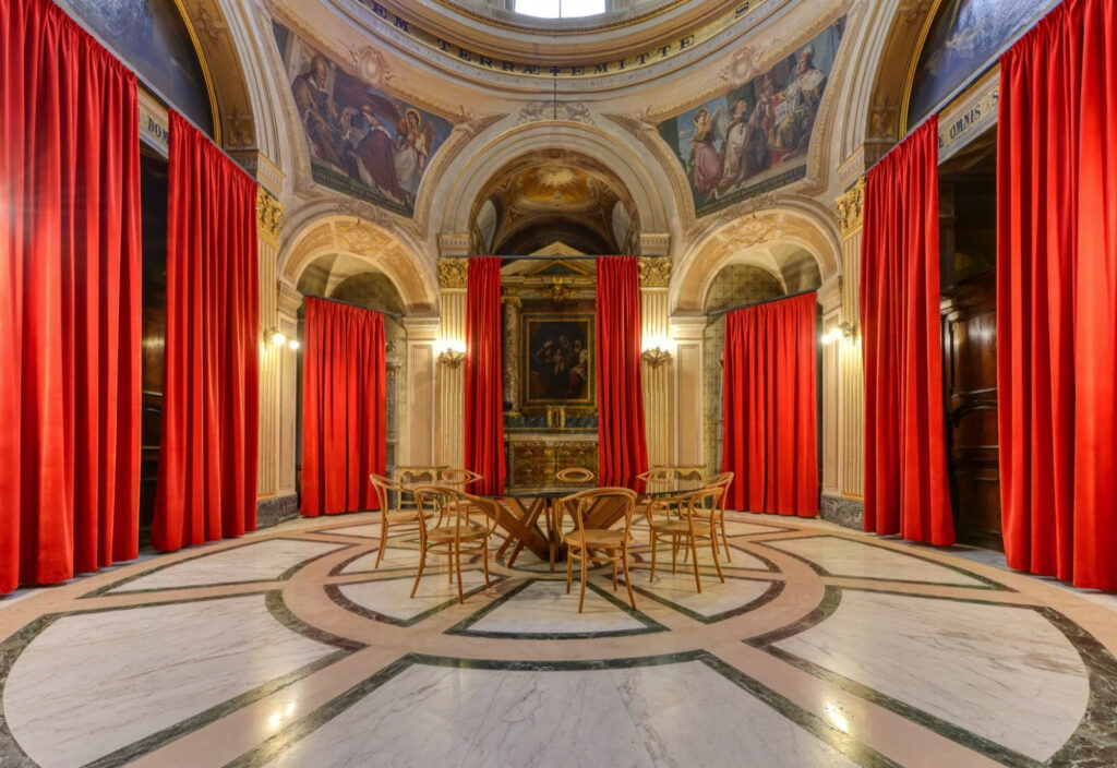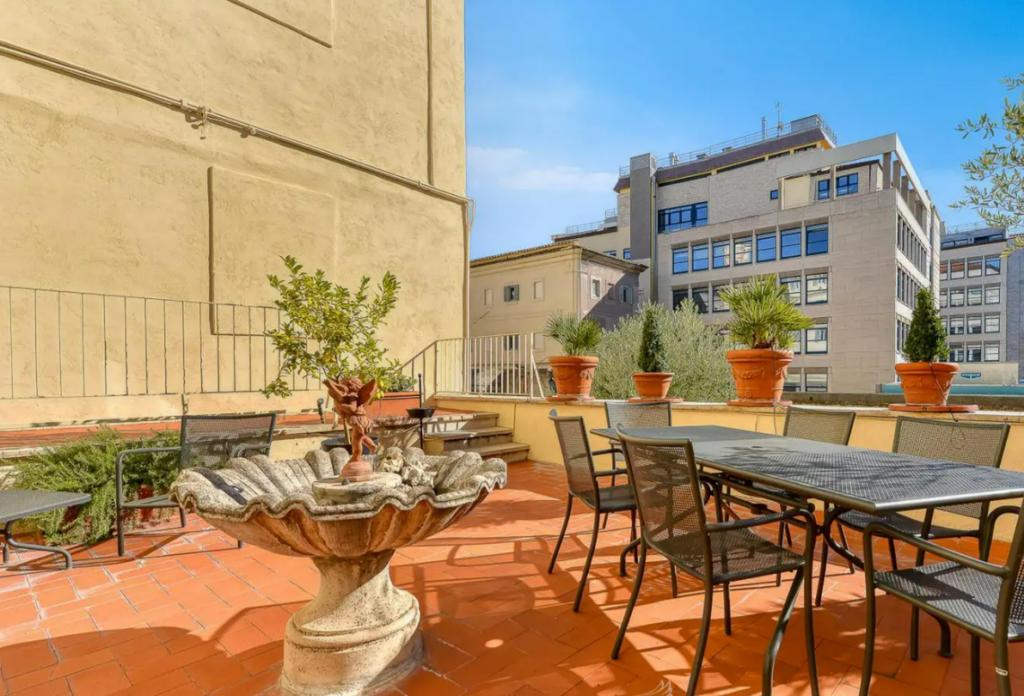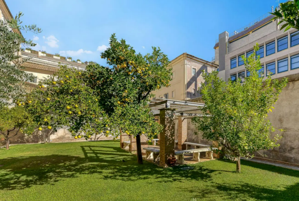 Oltre agli sfarzosi saloni di rappresentanza distribuiti su cinque piani, il vero cuore pulsante della proprietà si nasconde all’esterno. In un contesto urbano denso come quello romano, disporre di un giardino privato di oltre 600 metri quadrati è un privilegio assoluto. Tra alberi di limoni e aranci, il prato verde accoglie un raffinato pergolato, creando un’oasi di riservatezza e quiete. Ma la sorpresa più suggestiva è la chiesa sconsacrata del 1700, inglobata nel corpo principale del palazzo. Caratterizzata da una pianta a croce greca e un’incantevole cupola affrescata, la struttura ospita opere di Pietro Nelli, celebre ritrattista di Papa Clemente XI, regalando giochi di luce e architettura che tolgono il fiato.