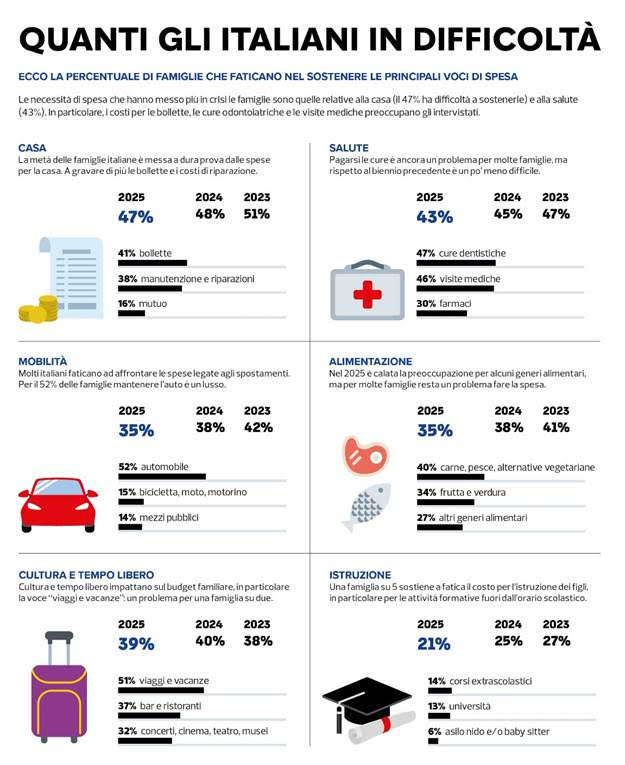 Non va meglio sul fronte della prevenzione e della cura. La salute continua a presentare un conto salato. Le spese odontoiatriche e le visite specialistiche rappresentano ancora un ostacolo per moltissime persone, evidenziando come l’accesso alle cure non sia sempre così fluido come si vorrebbe.