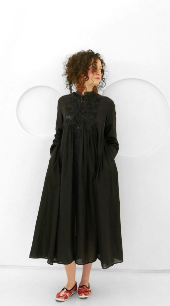 La collezione L’Arabesque per l’estate 2025 si distingue per una palette cromatica essenziale ma d’impatto. Il bianco domina negli abiti lunghi con ampie gonne a maxi balze in cotone, perfetti per le passeggiate serali lungo il mare. Il nero trova espressione negli abiti longuette in taffetà smanicati con collo a corolla, o nelle creazioni in sangallo con gonne a balze che richiamano l’eleganza delle dame dell’epoca.