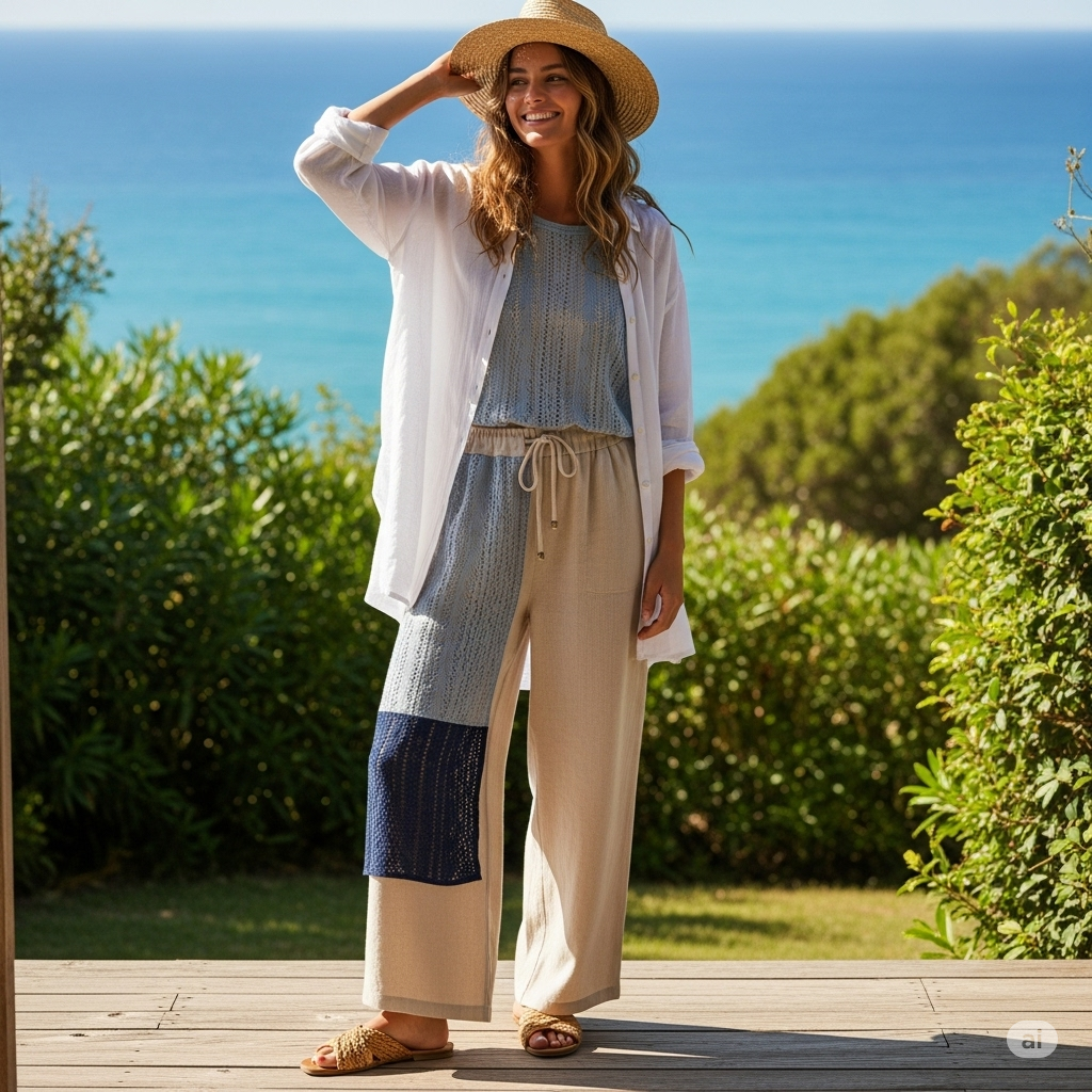 Elementi iconici? Camicie oversize portate aperte su top minimal, pantaloni ampi con coulisse in vita, maxi dress leggeri che ondeggiano come vele al vento, sandali flat intrecciati e accessori in paglia o corda. L’effetto è easy chic, con un richiamo continuo al mondo della vela, dei porticcioli eleganti e delle case sulla spiaggia arredate in stile marinaro.