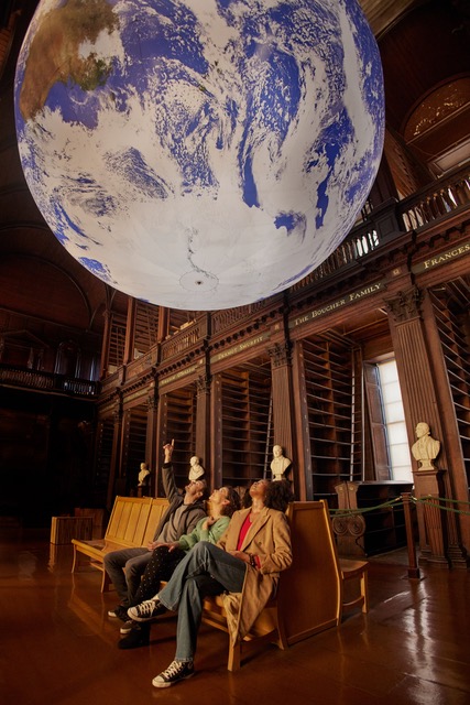 L’effetto è bellissimo e poeticamente surreale: la celeberrima Long Room della Old Library del Trinity College, con le sue boiserie, i candidi busti e gli antichi scaffali pieni di volumi, sembrano letteralmente accesi dalla sfera luminosa di Gaia: una delle cose da segnare assolutamente in agenda per un eventuale viaggio a Dublino. E per fare del bene alla Terra e alla cultura.