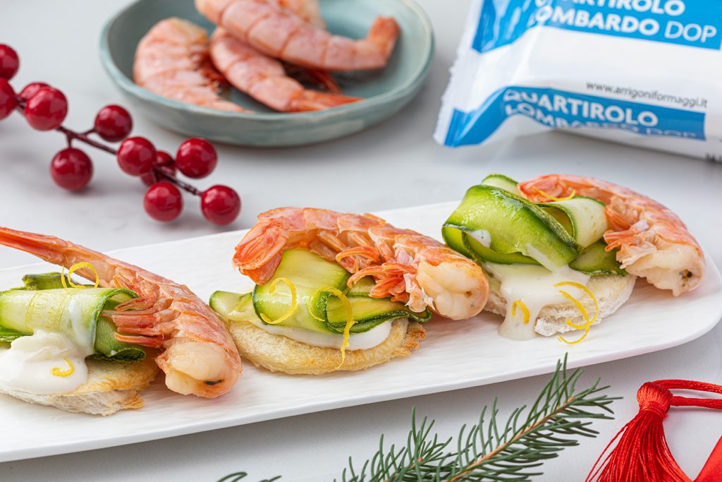 Tartare di Gamberi bianchi su crostone di pane pugliese con Quartirolo Lombardo DOP e zucchine.