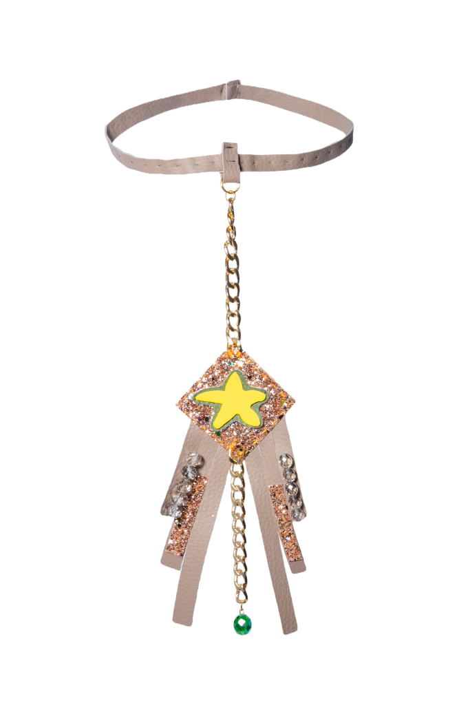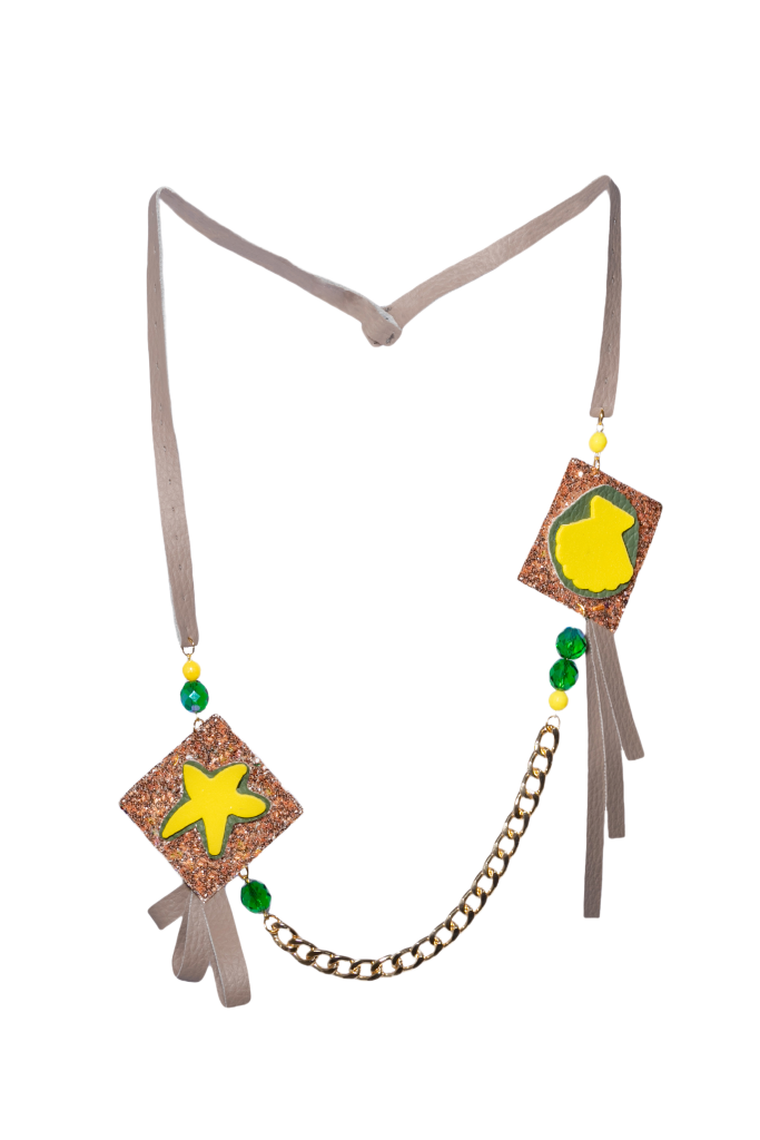 Emanuela Salatino nota designer di gioielli, si è ispirata proprio al Mermaidcore per creare la prima di una serie di collezioni estive che ci accompagnerà nell’estate 2023. Interamente realizzata, tagliata e cucita a mano, racchiude i tre elementi upcycling che hanno caratterizzato fin qui la sua produzione: plastica, ecopelle e pelle. I pezzi della collezione Mermaidcore sono stilizzati e realizzati in plastica riciclata, proveniente da scarti di utilizzo comune (le bottiglie dell’acqua minerale), colorati di giallo hanno un supporto verde di ecopelle nautica riciclata, che a sua volta ha un supporto in pelle riciclata, con lavorazione glitterata (ecopelle e pelle provengono da scarti di lavorazione industriale). Tra stelle, conchiglie, pesciolini e cavallucci marini è un viaggio nella tendenza cui non si può resistere, accompagnata da forme geometriche, frange lunghe, corte ed arricciate, cascate di catene (realizzate in alluminio riciclato), cristalli grigi e verdi… Un mondo marino che sembra essere riemerso per farci sognare e riportarci all’ingenuità dell’infanzia, facendoci rivivere le avventure romantiche e coraggiose della principessa sirena Ariel.