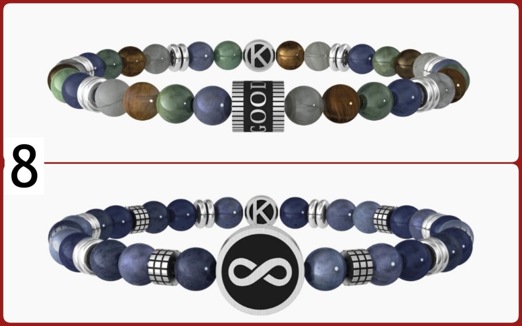 Bracciale elastico da uomo con sfere in acciaio lucido e satinato, black pvd e dumortierite blu con piastra tonda con simbolo dell’infinito e la scritta “family” sul retro. 34 euro