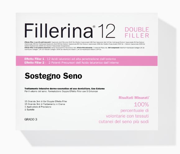 Fillerina 12 Double Filler Volume Seno è un trattamento dermo-cosmetico intensivo per favorire il riempimento dei tessuti cutanei del seno e aiutare a ritrovare forme più piene e morbide con un doppio effetto filler. Grazie ad una miscela di 12 Acidi Ialuronici di varie dimensioni e pesi molecolari, particolarmente efficaci nella penetrazione degli strati cutanei dall’esterno per favorire il riempimento e il rimpolpamento dei tessuti. Inoltre, grazie a 2 Potenti Precursori dell’Acido Ialuronico per la produzione endogena dello stesso da parte delle cellule dermiche e contribuire in modo sostanziale al meccanismo di riempimento dall’interno. Contiene inoltre il Complesso AQP3 che favorisce il flusso molto veloce delle molecole di acqua all’interno e all’esterno delle cellule, 3 Collageni e 2 Elastine per migliorare densità, tonicità ed elasticità cutanea.