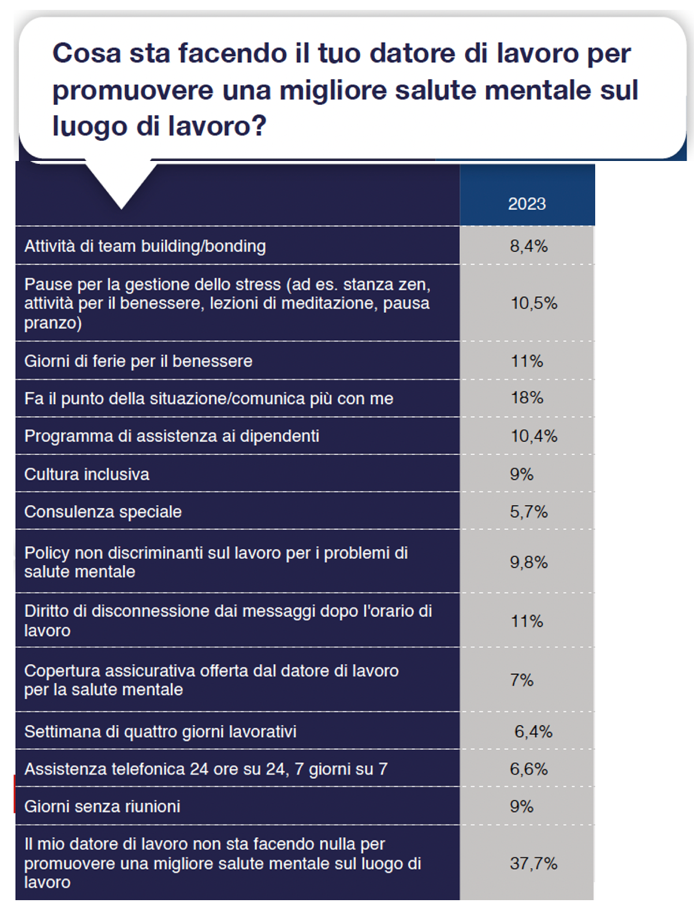 Il 18% pensa che invece sia attivo soprattutto tramite il dialogo, favorendo una comunicazione continua e costante, l’11% dichiara come il proprio datore di lavoro favorisca dei giorni di ferie per il benessere personale (per esempio in molte multinazionali il giorno del compleanno corrisponde a un giorno di ferie regalato), sempre l’11% dichiara come nella propria azienda sia in vigore il diritto di disconnessione da mail e messaggi fuori dall’orario di lavoro, mentre secondo il 10,5%  vi sono vere e proprie pause stabilite per la gestione dello stress (esempio stanza zen, meditazione, palestra,…).