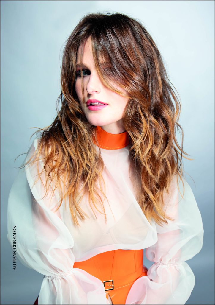 Morbido, scalato con ciuffo lungo a strati più corti madalle scalature armoniose e soffici, si accende di toniginger realizzati con la tecnica Velvet-U Star esclusivadei saloni Urban Cdb Salon.