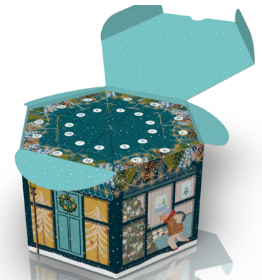 Il nuovo Calendario dell’Avvento è uno scrigno esagonale che richiama calde atmosfere casalinghe, dalla preparazione degli addobbi allo scambio dei doni.