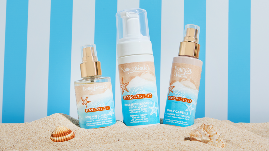 Sull’onda del successo dell’omonima collezione make-up ispirata alla magia dell’estate italiana, Bottega Verde completa la gamma con Lido  Paradiso Corpo e Capelli, la mini-collection in limited edition pensata per vivere pienamente il mare e la spiaggia offrendo a corpo e capelli idratazione, luminosità e una nuova profumata carezza che sprigiona tutta la gioia dei momenti più felici e spensierati.  Un vero rituale di bellezza che sublima i look più glamour della stagione, sprigionando il fascino e la vitalità della dolce vita estiva.