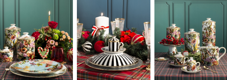 Le collezioni in porcellana, arricchite da un vero filo oro applicato a mano, si distinguono per la ricchezza delle decorazioni in decalcomania sottosmalto in doppia cottura e per l’eleganza intramontabile delle righe regimental che adornano il retro dei piatti fondi e gli accessori. La gamma è ampia e scenografica: piatti piani, fondi e dessert, alzatine per dolci, vassoi da portata e persino vasi decorativi diventano elementi capaci di creare mise en place dallo stile unico e senza tempo.