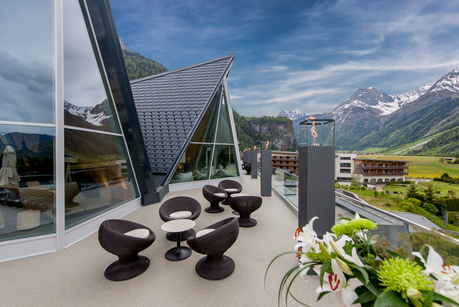 Per chi vuole fare una pausa sorseggiando qualcosa di fresco e assaggiando qualche prelibatezza tirolese, può accomodarsi sulla terrazza dell’hotel con vista su cime imponenti e sulla pista ciclabile dell’Ötztal, che passa proprio davanti ad AQUA DOME. Il successo dell’estate 2025 sono le limonate e i cocktail analcolici fatti in casa, che vengono mescolati con molta fantasia.