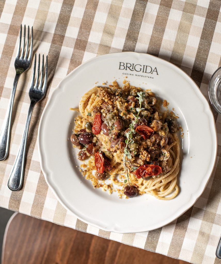 Brigida Cucina Napoletana, nel cuore della Napoli della Belle Époque, in via Santa Brigida, a ridosso della centralissima Galleria Umberto, è un’osteria contemporanea che rievoca il passato con uno sguardo moderno, portando in tavola le ricette ritrovate della tradizione napoletana. Il piatto simbolo è lo Spaghetto alla Gravunaro, un piatto povero della tradizione partenopea, che prende il nome dal “gravunaro” ovvero il venditore ambulante di carbone che un tempo girava per le strade di Napoli. Si dice che il piatto sia nato, quasi per caso, quando una massaia mise insieme pochi e semplici ingredienti per sfamare l’uomo dopo una lunga giornata di lavoro. Ancora oggi i cuochi di Brigida preparano questa ricetta come una volta, con mollica di pane insaporita con acciughe, capperi, olive e pinoli. Ad anticipare l’arrivo della portata il rito della bavetta che viene avvolta dal personale di sala intorno al collo dell’ospite per permettergli di abbandonarsi completamente al piacere dell’assaggio.